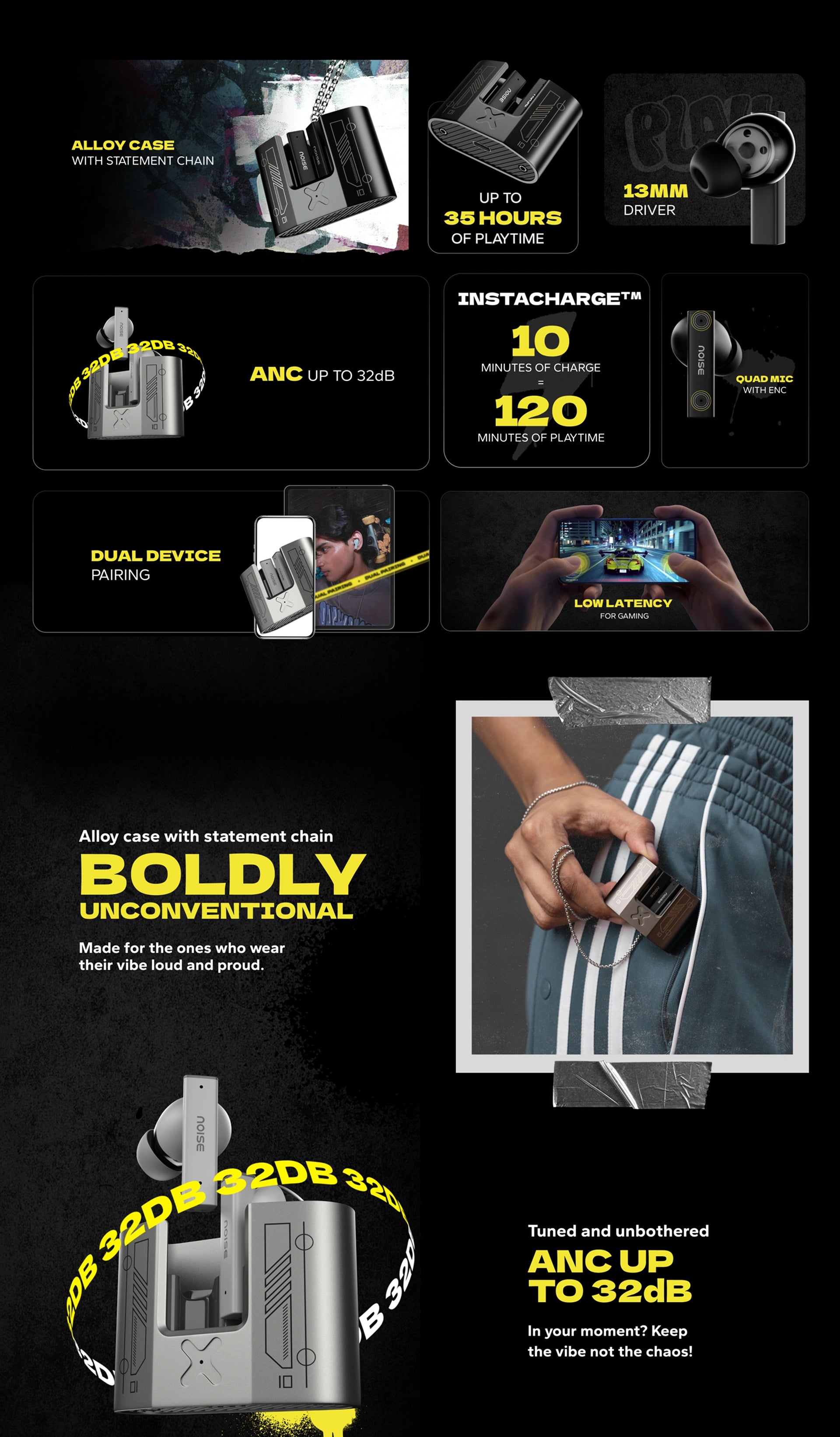 India’s First Full‑Metal Alloy Charging Case: These earbuds pioneer the segment with a sturdy, eye-catching metal alloy case—a design-first move by Noise in the Indian TWS market. The case comes with a detachable chain for stylish and secure portability.
