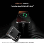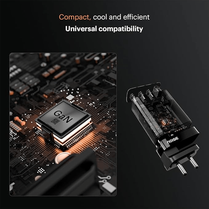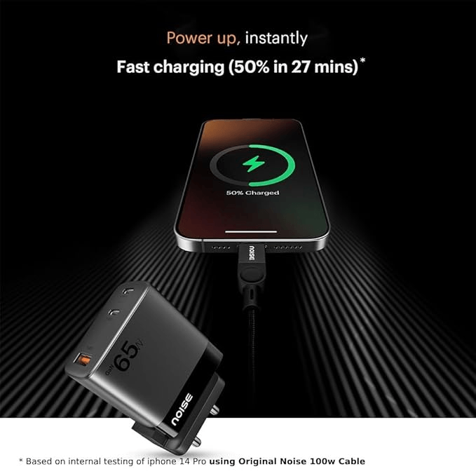 - Fast Charging: Power up your device up to 50% in just 27 minutes*. The maximum rated capacity of the adapter is 65w. The max output required for laptop & phone fast charging will be achieved only when using a certified and compatible cable rated for 65w+ output. For best results use Original Noise 100w Braided Cable compatible with all adapters. (*0-50% in 30mins achieved via internal testing on iphone 14 pro using Original Noise 100w cable)